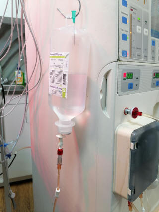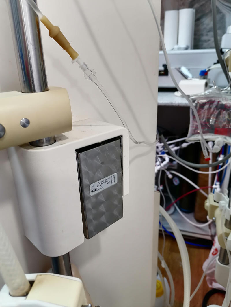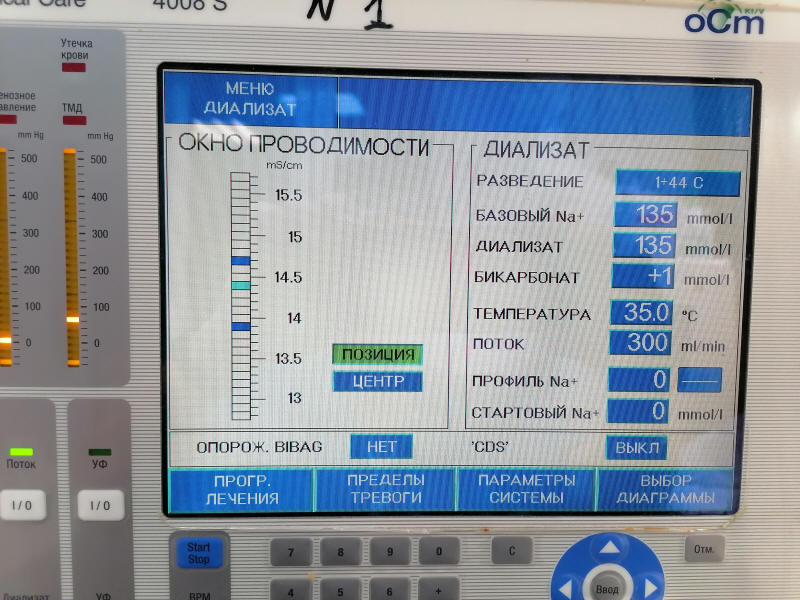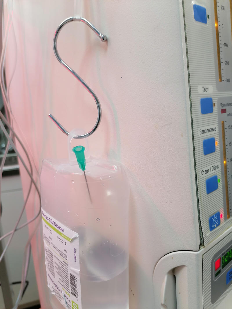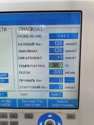 Далее подсоединяем физраствор с гепарином, подключаем шланги с диализной жидкостью к диализатору, настраиваем меню диализата