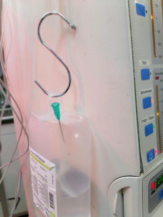 Физраствор подвешиваем в заранее подготовленном месте или на стойку аппарата.