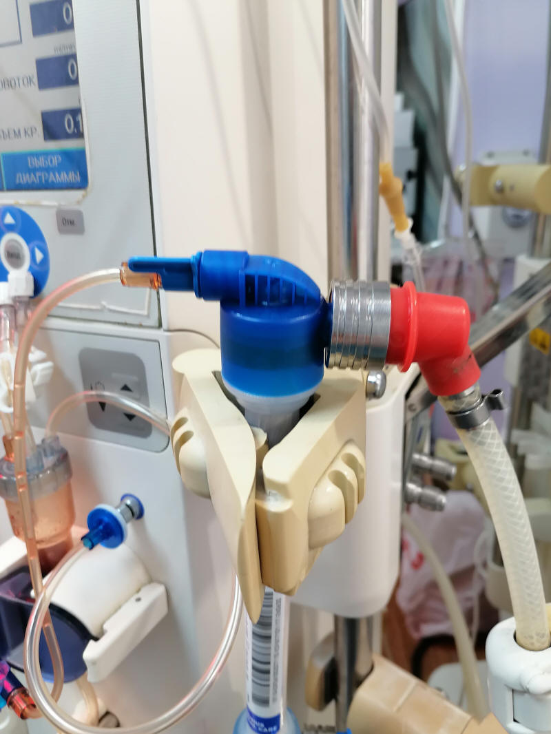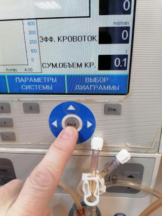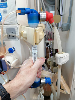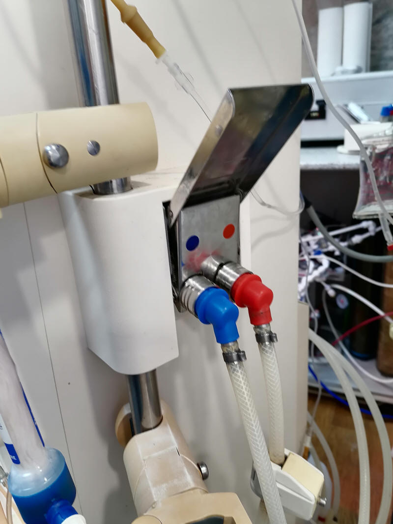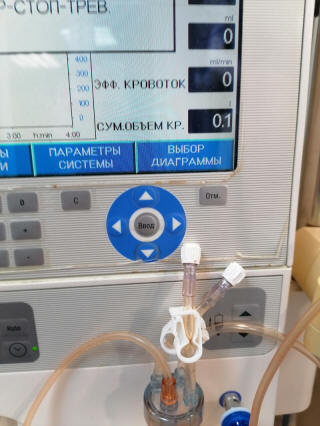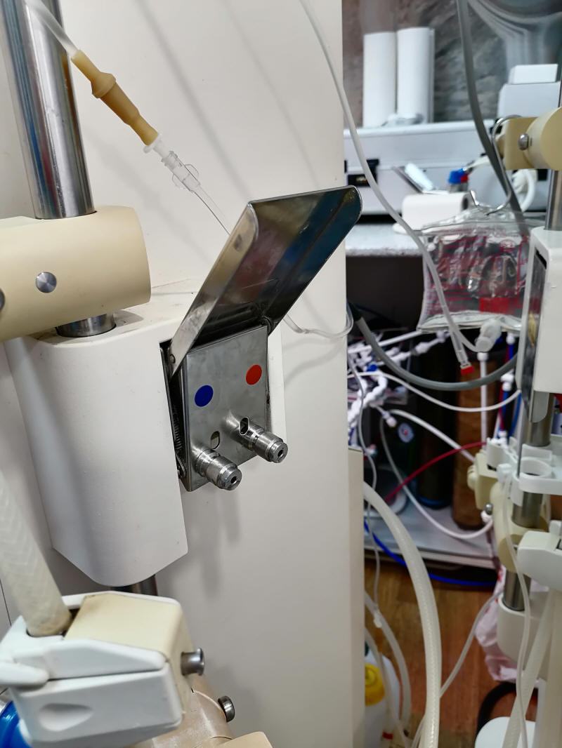 На нижний порт с подключенной красной артериальной линией - подключаем синий шланг диализата - это возврат диализной жидкости.