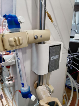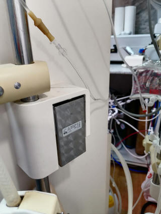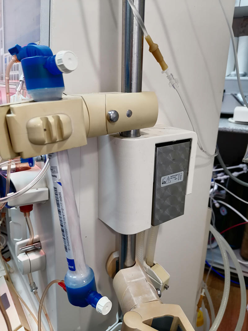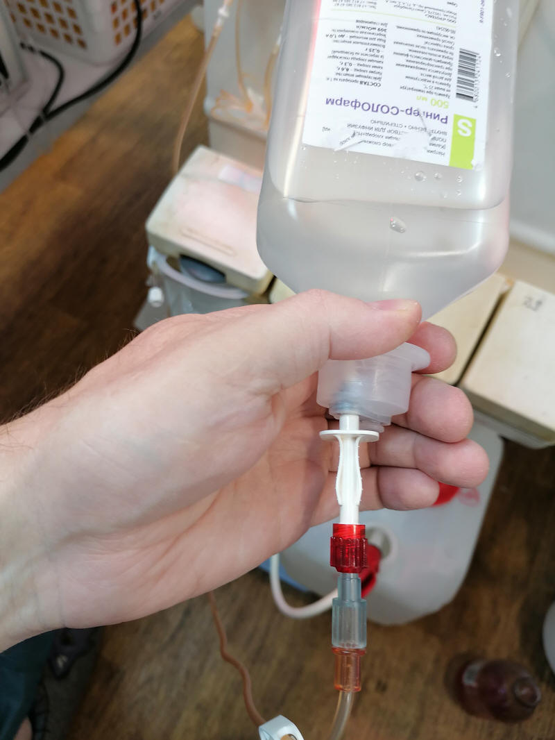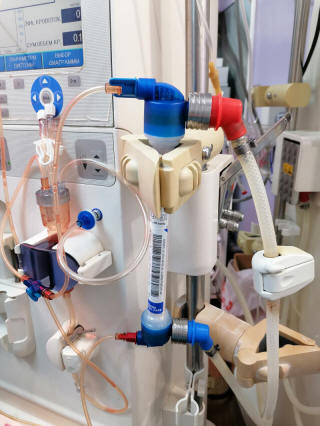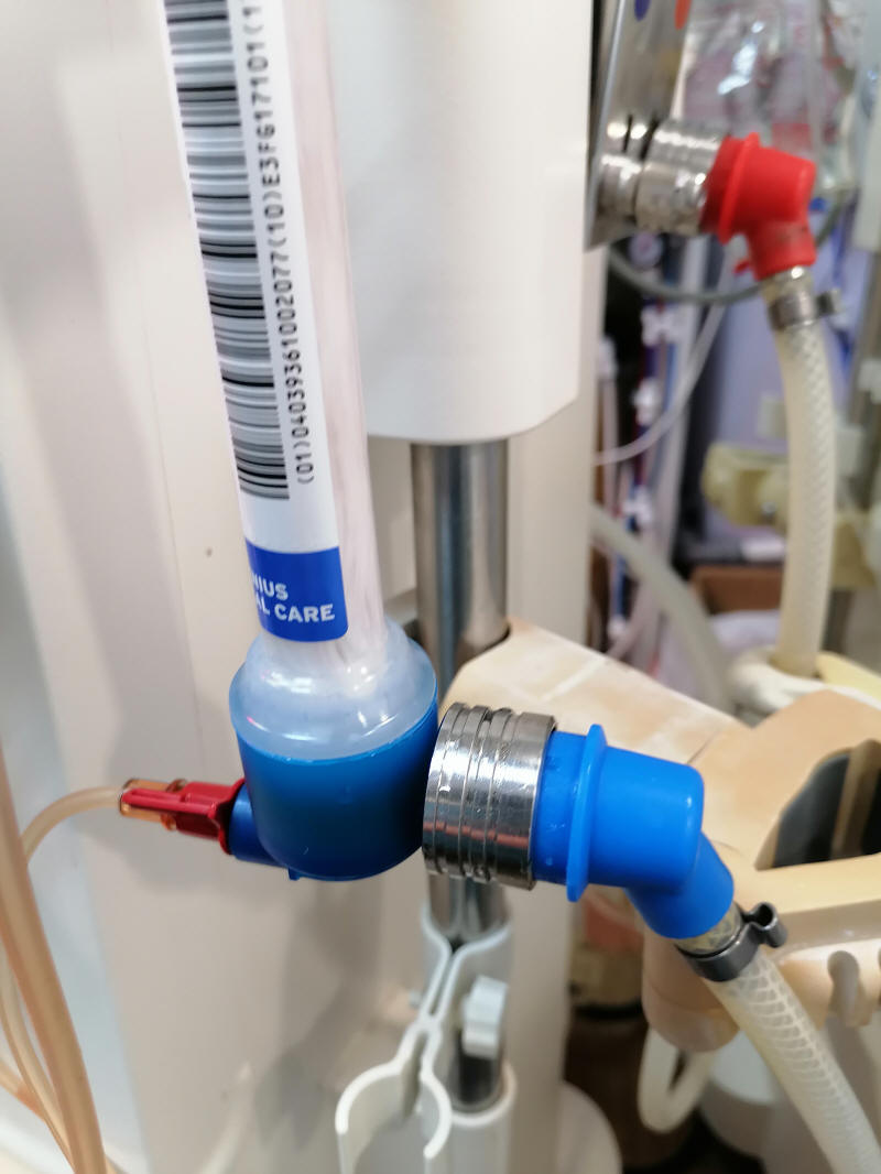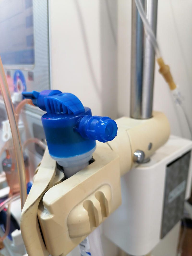 На нижний порт с подключенной красной артериальной линией - подключаем синий шланг диализата - это возврат диализной жидкости.