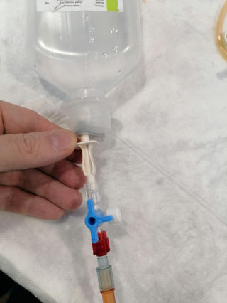 Вставляем пластиковую иглу во флакон физраствора с гепарином.