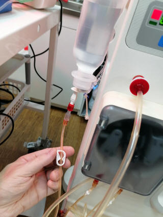 Открываем зажим Роберта на пакете для сбора физраствора.