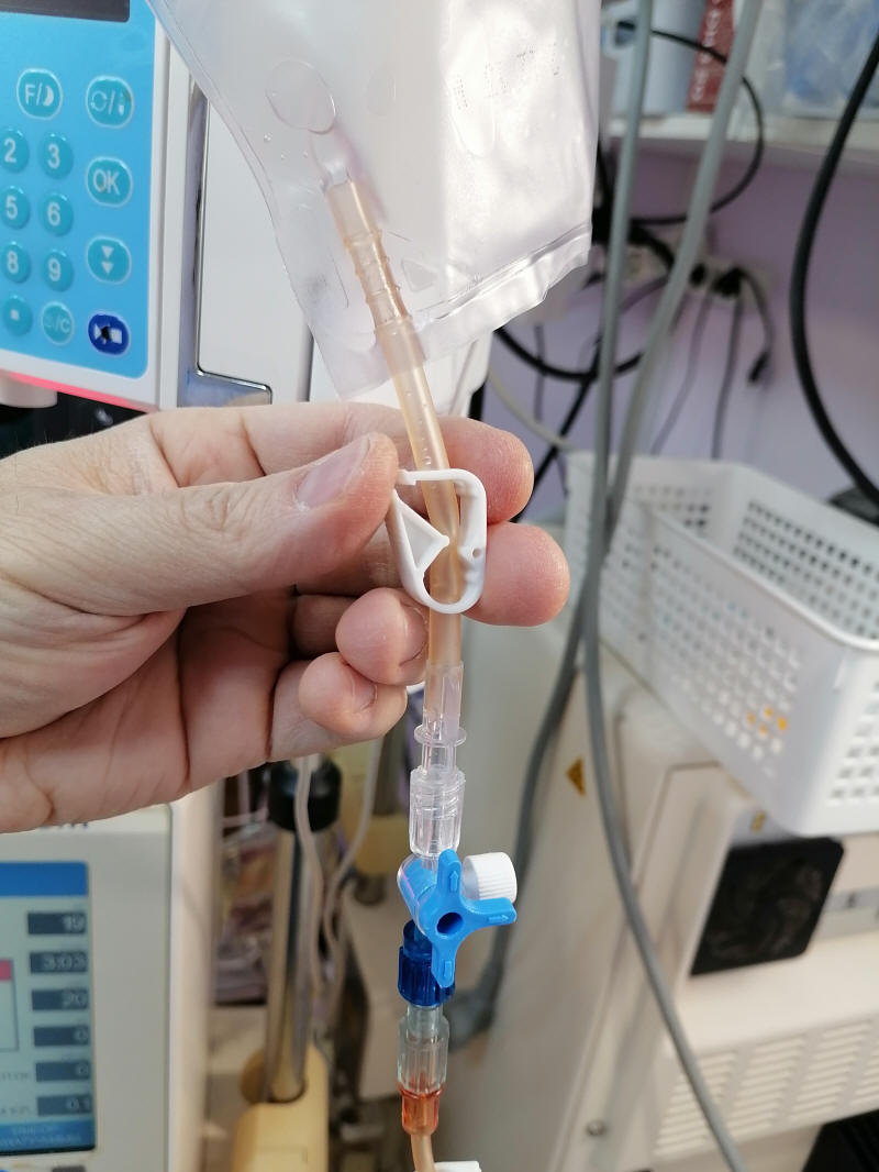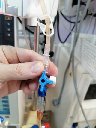 Проверяем фиксацию порта контроля венозного давления синего цвета.