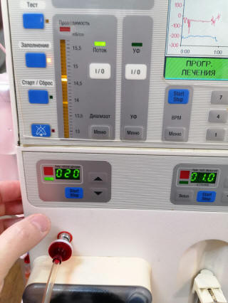 Индикатор работы насоса крови горит зеленым, цифры показывают скорость.