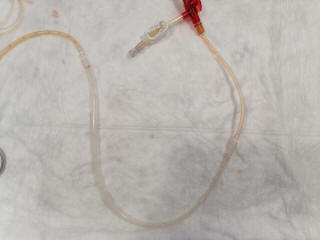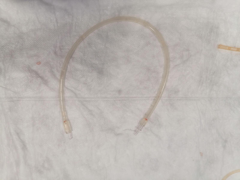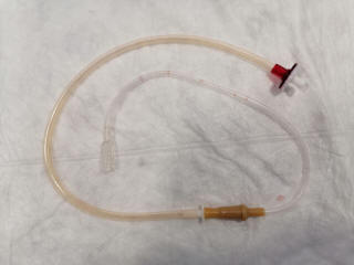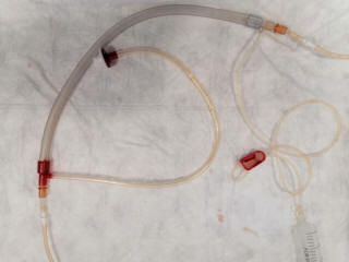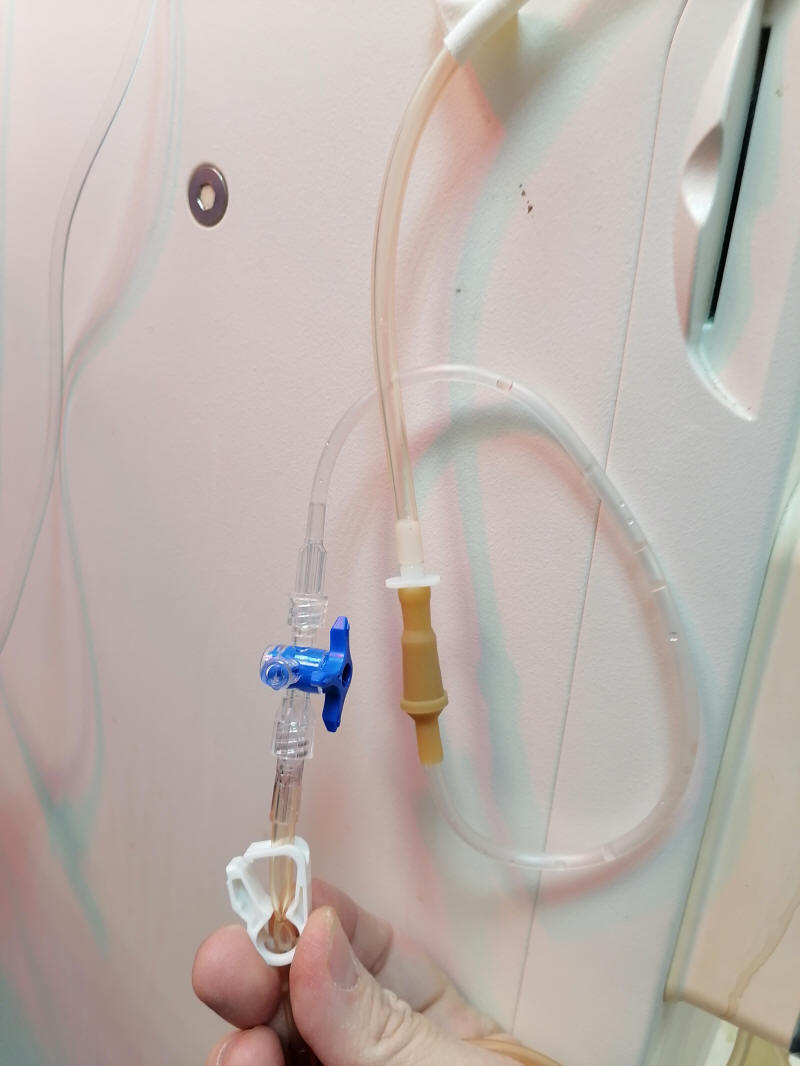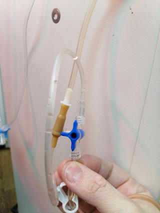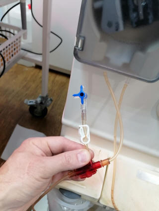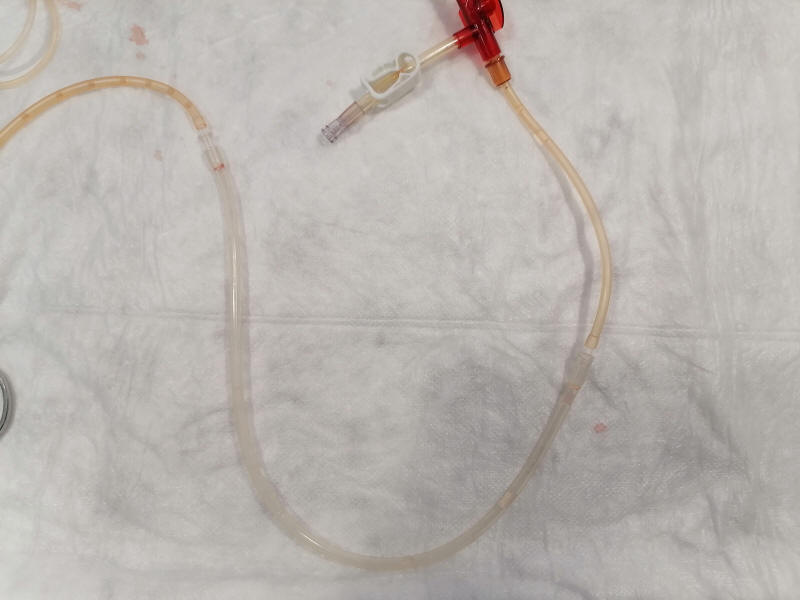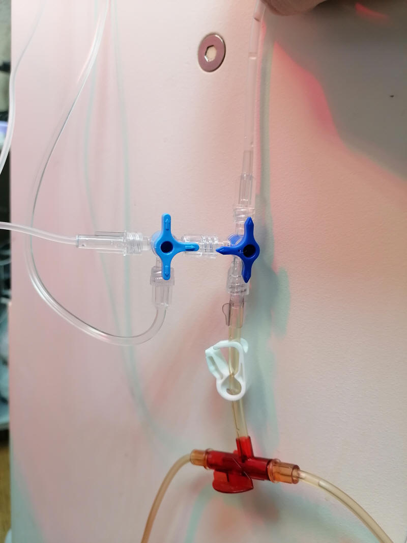 К боковому порту тройника подсоединяем тройник от экстренного физраствора и цфг. Экстренный физраствор по прямой линии, а цфг по боковой.