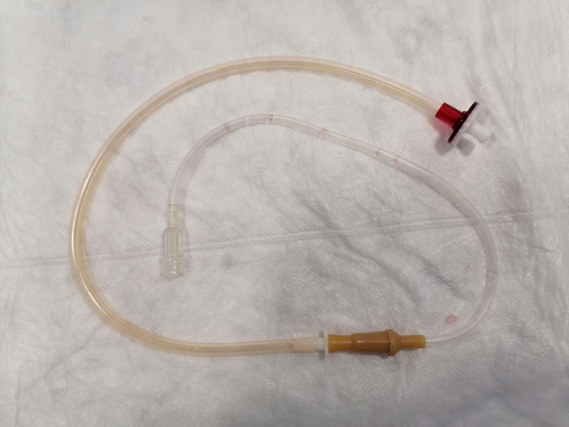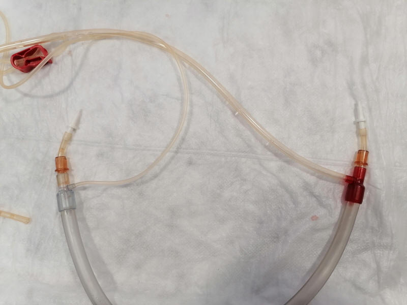 К одному из портов воздушной ловушки подсоединяем линию гепарина - отдельный удлинитель для инфузомата.