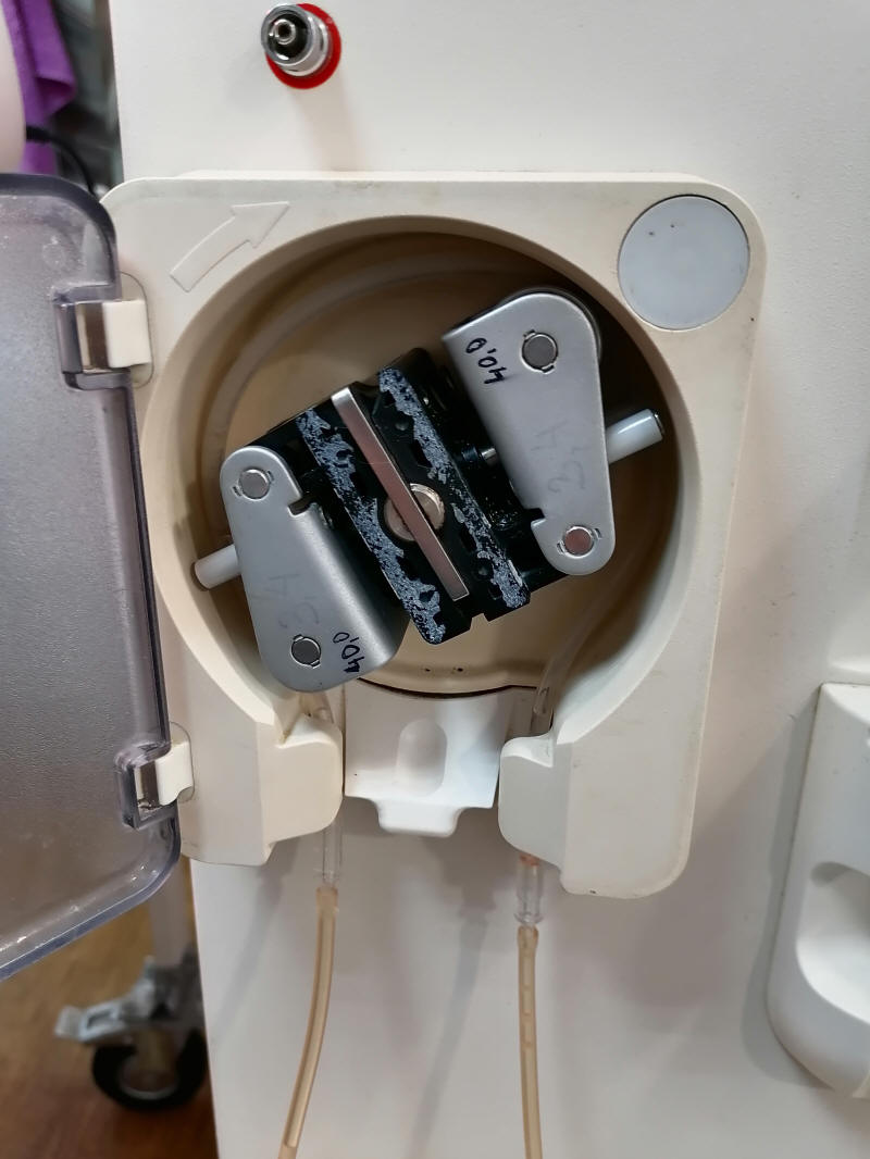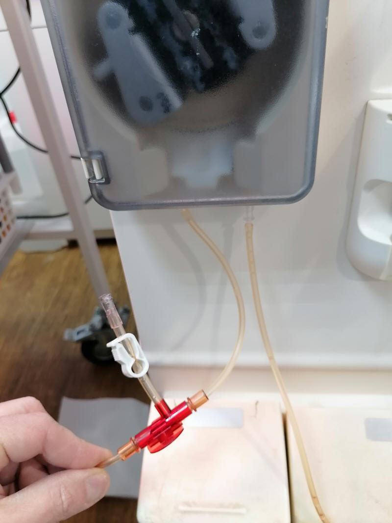 Заправили насосный сегмент, порт забора крови с дополнительным ответвлением должны оказаться с левой стороны насоса.